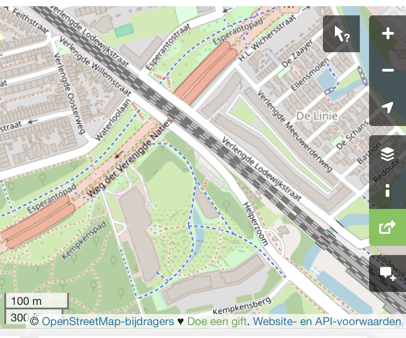 Het Esperanto-pad is voor fietsers en wandelaars. Het pad loopt onder de eveneens nieuwe Esperantotunnel door en verbindt twee delen van het nieuwe plantsoen. Het zorgt voor een veilige groene verbinding tussen twee wijken. En dat alles bevindt zich boven de lawaaierige en milieuvervuilende auto’s op de rondweg diep onder de grond.