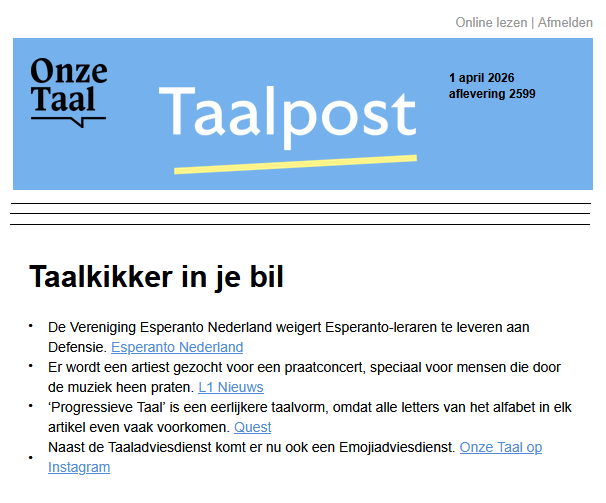 In de nieuwsbrief van Onze Taal, Taalpost, was de 1-aprilgrap ook opgenomen, met een link naar onze website. Zelf had Onze Taal ook een leuke 1-aprilgrap bedacht.