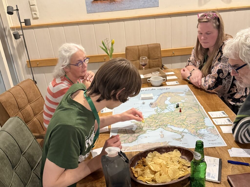 We kwamen wat later aan op vrijdagavond. In de zaal zaten mensen aan verschillende tafels; jong en ouder, man en vrouw. Aan de meeste tafels deden ze een spelletje: vortludo. Thijs zag een bekende van een kunveno in Rotterdam en sloot zich bij de jongeren aan. Ik zag een tafel waar geen spel gespeeld werd en ging daar zitten. Een tikkeltje overmoedig; het bleek de tafel van de docenten te zijn. In mijn beste Esperanto antwoordde ik op de belangstellende vragen. We waren welkom!